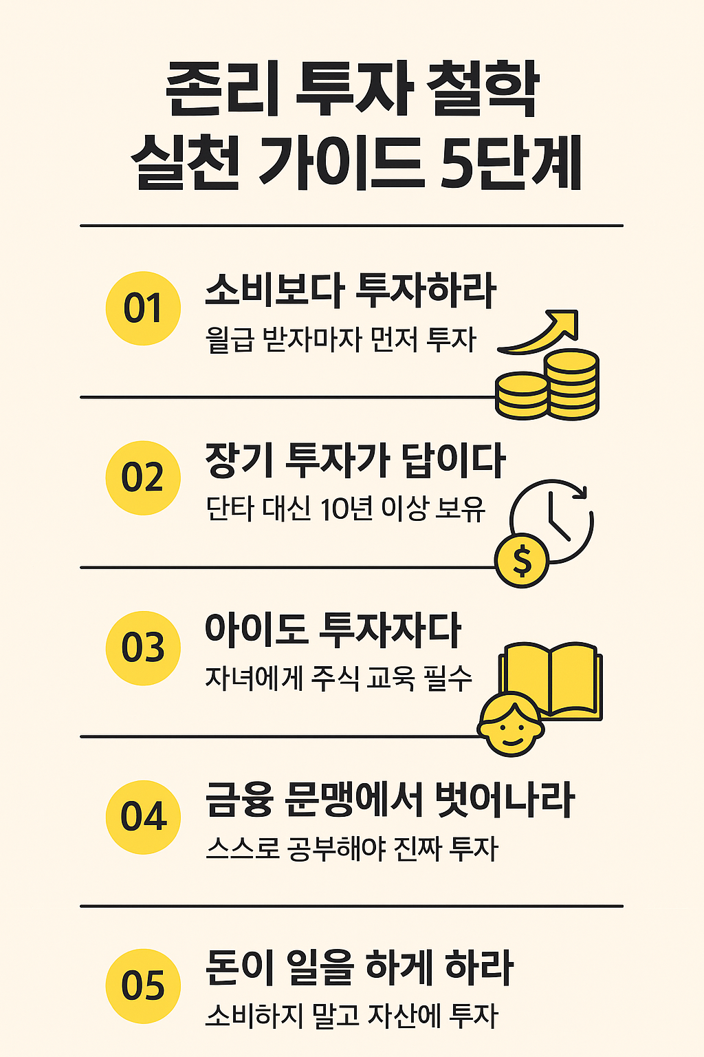 | 금융 문맹 탈출 | 유튜브 대신 책, 스스로 재무 공부 | 『존리의 돈 공부』 등 독서 |