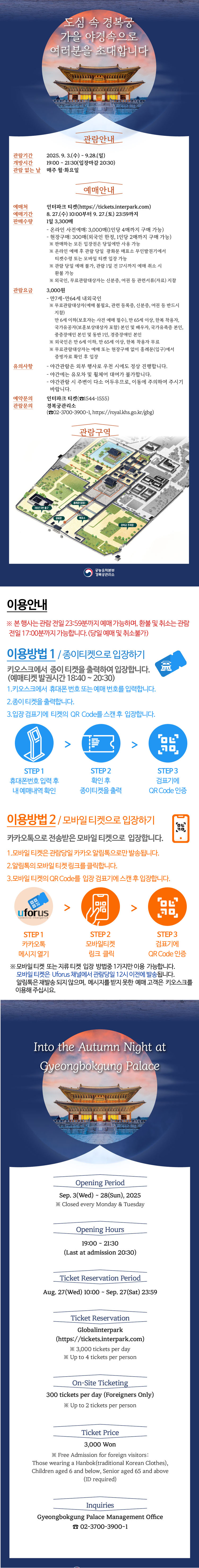- 예매 필수: 야간 개장은 경쟁이 치열해 티켓을 미리 예매해야 합니다. 보통 오후 2시에 티켓이 오픈되니, 놓치지 마세요!
